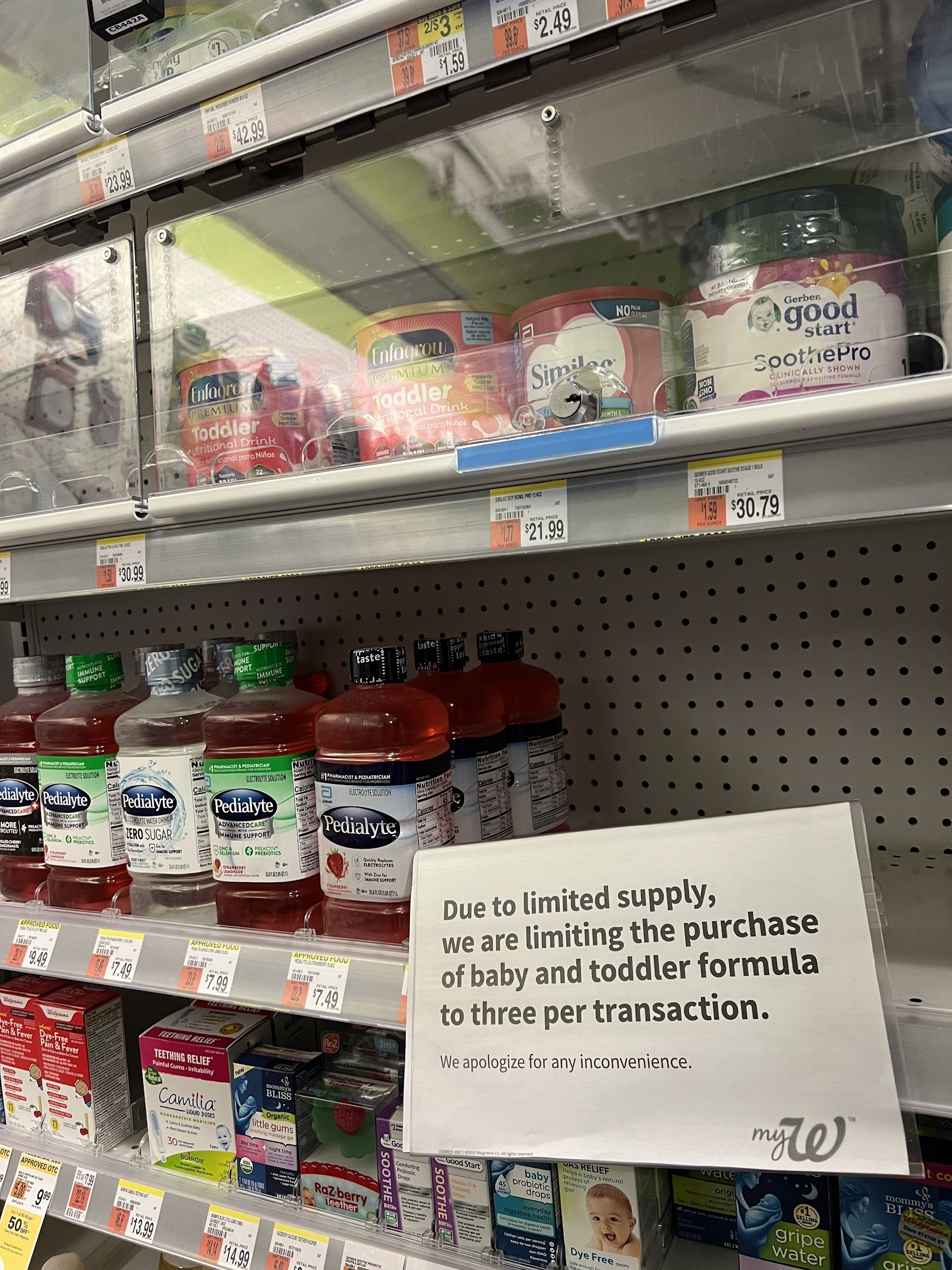 CNNが今週伝えたデータによると、全米の粉ミルク製品の40%が、現在品切れ状態にあるという。クイーンズ区フォレストヒルズにあるウォルグリーンには10日、在庫が3缶しかなかった。同区キューガーデンズにあるCVSでも、10日に販売された粉ミルクは全部で12缶。できるだけ多くの客に商品が行き渡るよう、店内には、粉ミルクの購入を「1人あたり最大3缶まで」と制限する看板が掲示されていた。