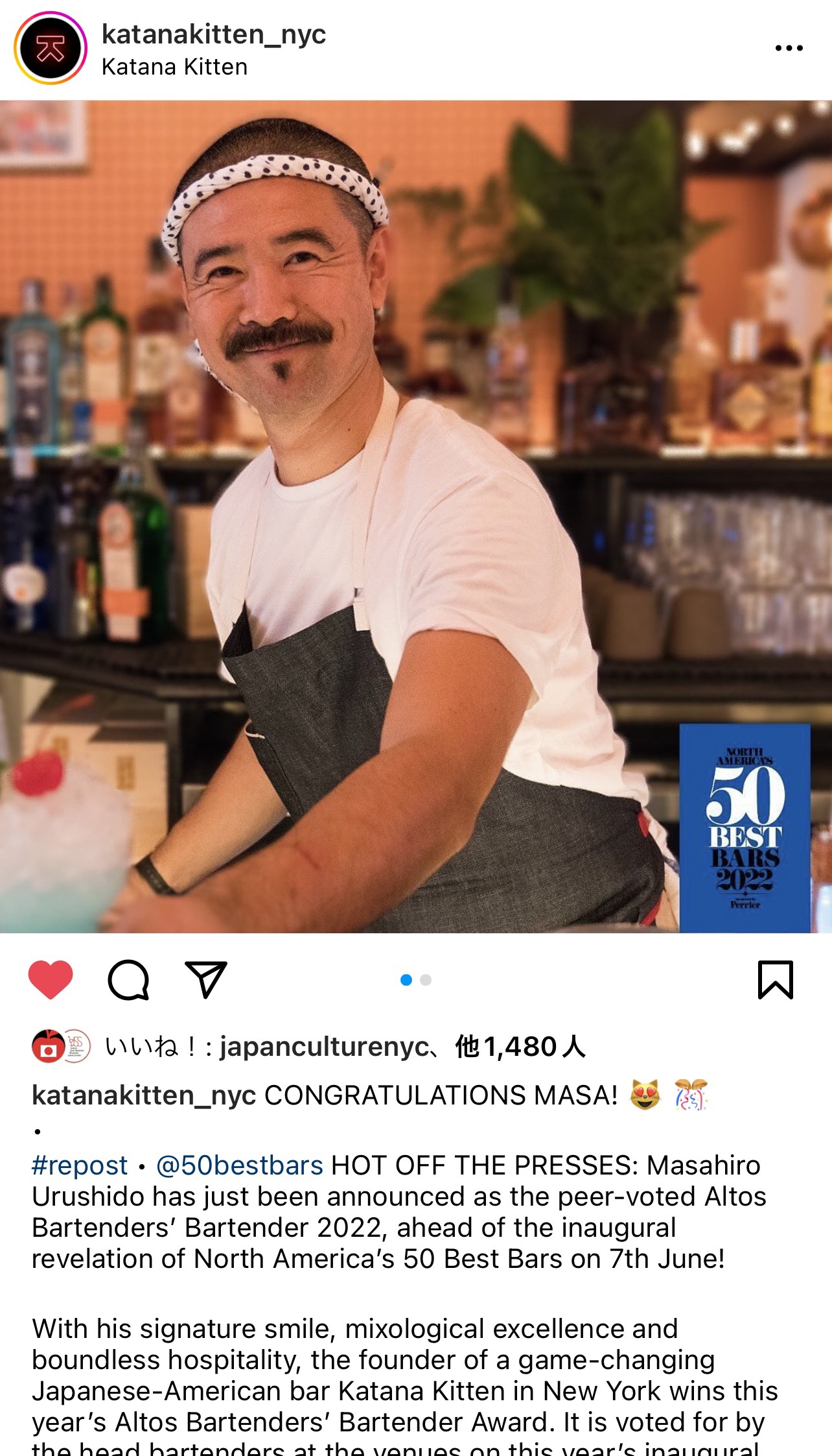 「世界のベストレストラン50」を主催するウイリアム・リード社が今年から始めた「北米のベストバー50」で、マンハッタン区グリニッジビレッジのバー「カタナ・キッテン(Katana Kitten)」の経営者、漆戸正浩さんが、今年度の北米のベスト・バーテンダーに選ばれた。同店は、昨年度の「世界のベストバー50」で10位にランクインしている。タイムアウトが24日、伝えた。