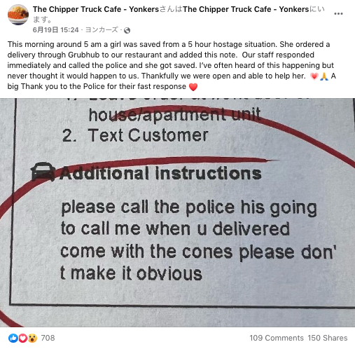 被害者の女性(24)は、出会い系アプリで知り合いチャットをしていたケモイ・ロイヤル被告(32)と会うことに合意。実際に会ったところ、暴行、強姦され、携帯電話を取り上げられた。19日早朝、食べ物を注文したいと言って携帯電話を取り戻した女性は、グラブハブのアプリから、ニューヨーク州ヨンカーズにある「チッパートラックカフェ」に食べ物を注文。コメント欄に「警察を呼んでください。バレないようにお願いします」と書き込んだ。