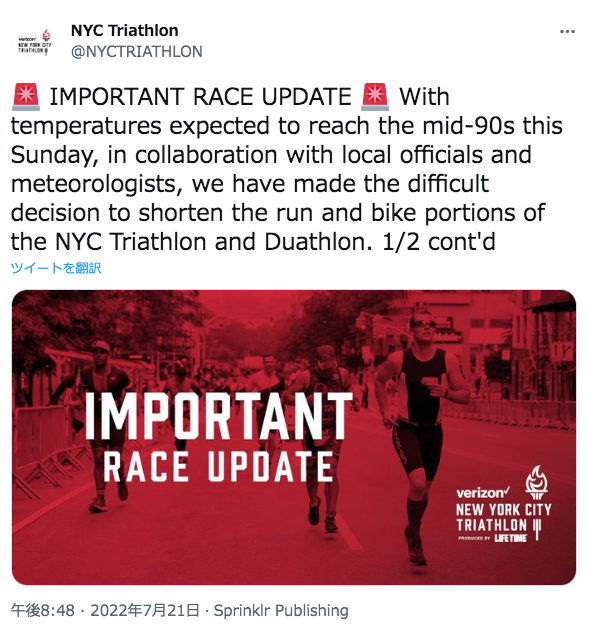 この日も高温注意報が出たため、長距離走を6.2マイルから2.5マイルに短縮。25マイルの自転車ロードレースの距離も半分にした。ハドソンリバーの遠泳、0.93マイルは変更しなかった。主催者は「競技参加者、ボランティア、医療スタッフ、観客の安全と健康を最優先にした」とフェイスブックで説明した。ただ、フロリダ州南部で訓練したという参加者は「過酷な気候条件も競技の一部。真のトライアスリートを侮辱している」と投稿した。FDNYによると、当日は5人が手当を受け、そのうち1人が入院した。熱中症によるものかどうかは不明だ。今年の大会では、男子部門でブラジル出身のダニロ・ピメンテル選手が、女子部門ではニューヨーク州ロチェスター市から参加したエイミー・サイマーマン選手が優勝した。