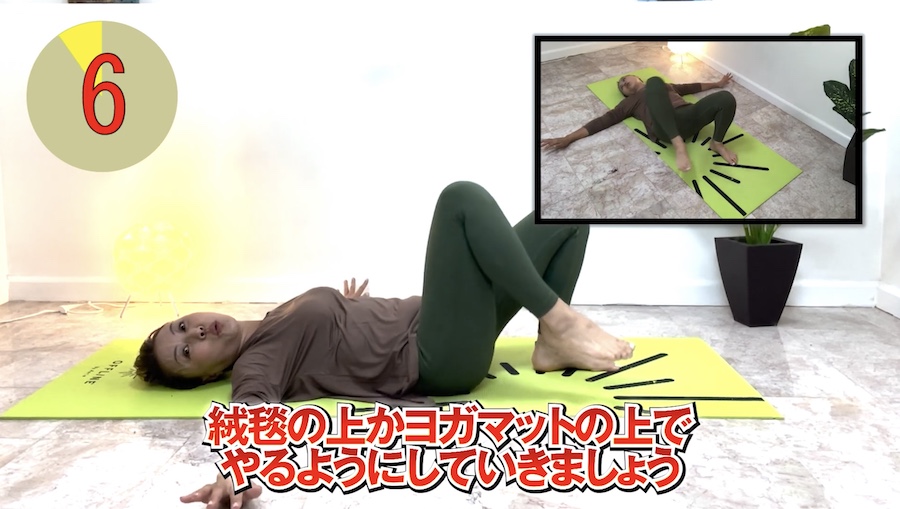 - その体勢で右ヒザをパタンと右の床に着くところまで倒します。