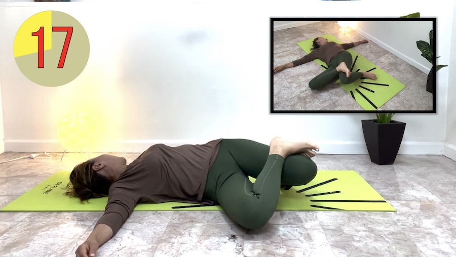- 足をチェンジして、左ひざを左へ倒し左の床につけて、右手を眺めましょう。