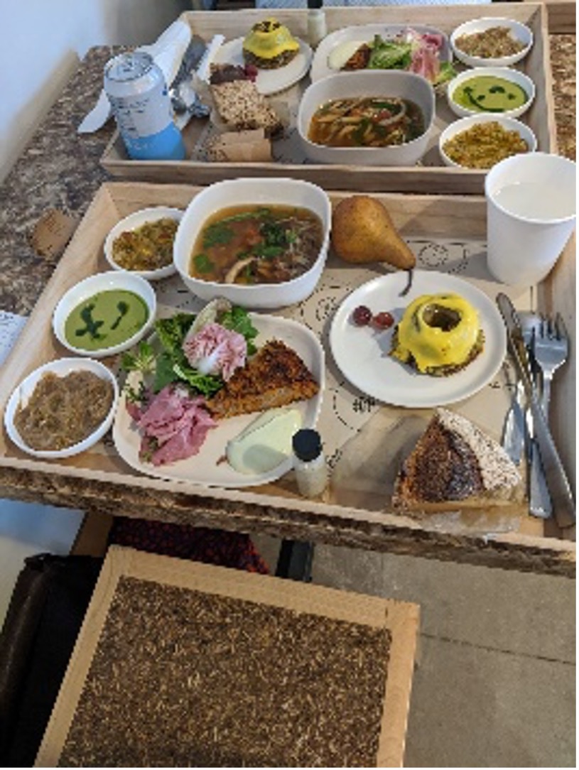 しかし、今はランチをやっているのです!レストランの横にあるショップで、世界のブルーヒルの食事が少しだけ感じられます。夕食はほぼ野菜が中心です。手で食べることが多いですね。この野菜はさきほどの農業育成の場として、この施設内で作った野菜を中心に提供されています。いまのトレンドですねー。