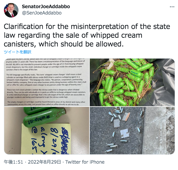 法律を提案したジョセフ・アダボ州上院議員は、年齢制限の対象となるのは、ホイップクリーム缶そのものではなく、キャニスターの中にある小型の個別チャージャーやカートリッジであると説明。ツイッターに「私の法案の文言と意図に誤解があった」とする声明を投稿した。