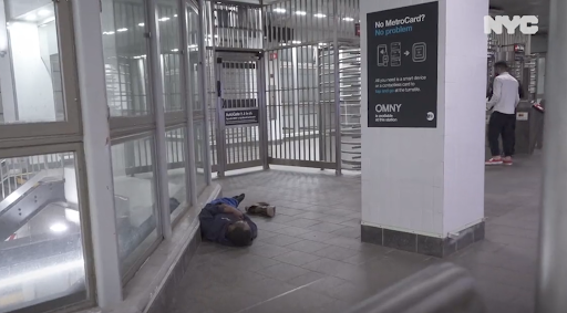 駅構内で寝そべるホームレス(Photo: アダムズ市長の公式ツイッターよりスクリーンショット=5月25日)