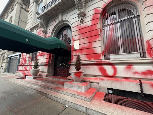 落書きは窓や二重ドアを含む外壁一面に残されている。文字は判読できないが、ロシアのプーチン大統領がウクライナ4州併合に関する演説を行う数時間前に起きていることから、これに抗議するものと考えられている。NYPDはバイアス犯罪の可能性も視野に入れて捜査を進めている。ロシア領事館はこの件に関しては米国務省に連絡するよう求めており、国務省は今のところコメントの求めに応じていない。また同領事館は同日の予約を全てキャンセルした。