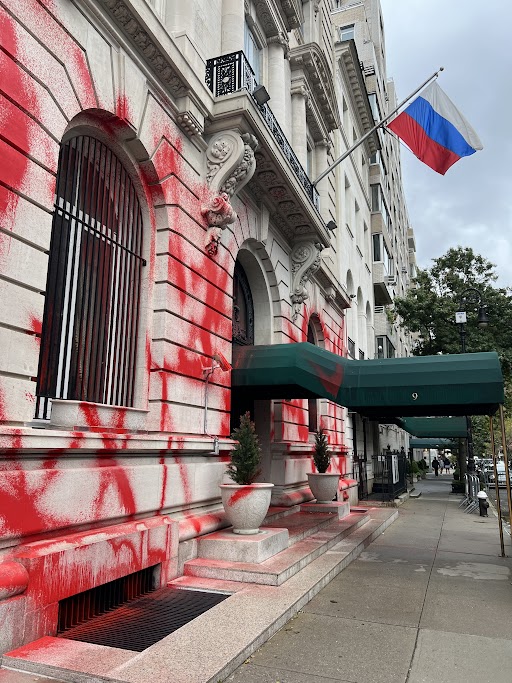 9月30日未明、ニューヨーク市内のロシア領事館外壁が赤ペンキで落書きされているのが見つかった。同日、ニューヨーク・タイムズが報じた。