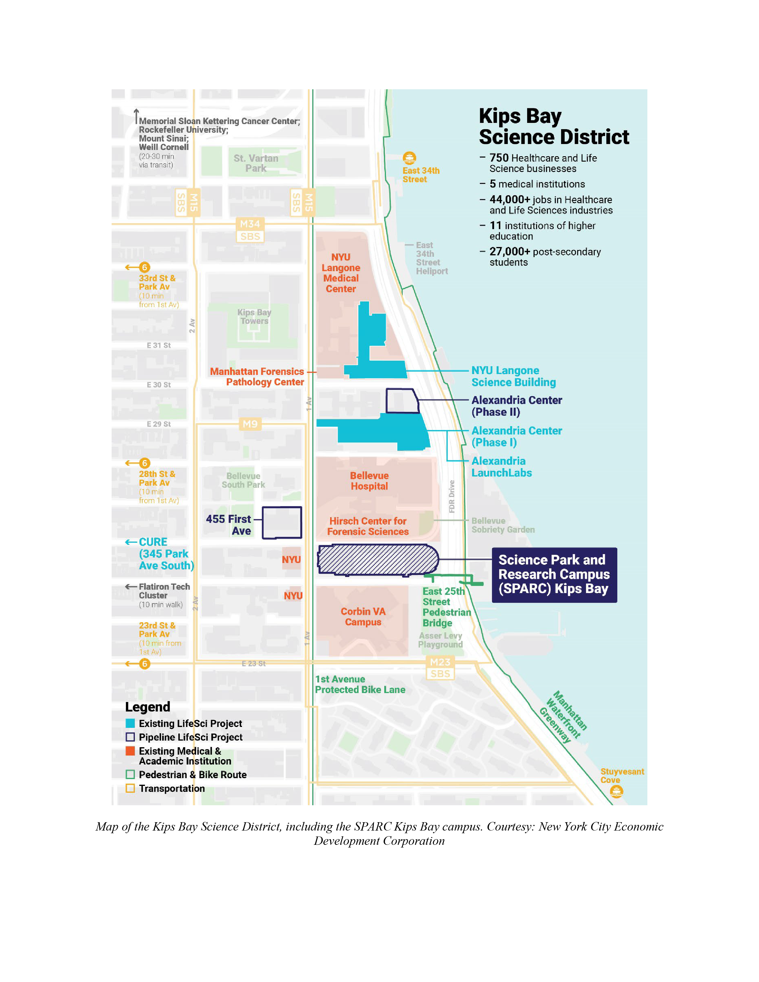 この施設の名称は「サイエンス・パーク・アンド・リサーチ・キャンパス(SPARC)キップスベイ」。現在ハンター・カレッジのブルックデール校が使用する150万平方フィートの土地を再開発する。ここに、ハンター・カレッジの看護師学校、ヘルス・アンド・ホスピタルズ(HHC)の医療施設、ライフサイエンスに特化した高校やオフィスビルを造る。「新しいアイデアを生み、雇用を創造し、全米から人が集まる」とアダムズ氏。「教室やラボからオフィスまで、必要なものは全て揃える。ライフサイエンスの分野でニューヨーク市が世界をリードする」と続けた。