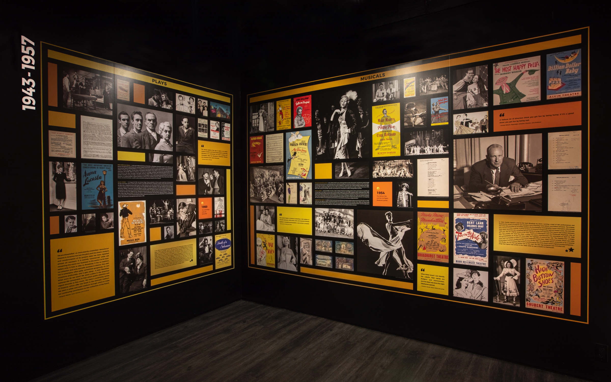 ミュージカルや演劇、それらを創作する人々を称えており、没入型でインタラクティブな体験ができる。デザイナーやアーティスト、演劇研究家の作品を、ブロードウェーの誕生から現在から未来に至るまでのタイムラインに沿って展示。画期的な瞬間や華やかな衣装をはじめ、小道具、レンダリング、貴重な写真、ビデオなどの展示にハイライトをあて、ブロードウェーの歴史を視覚的に楽しめる。