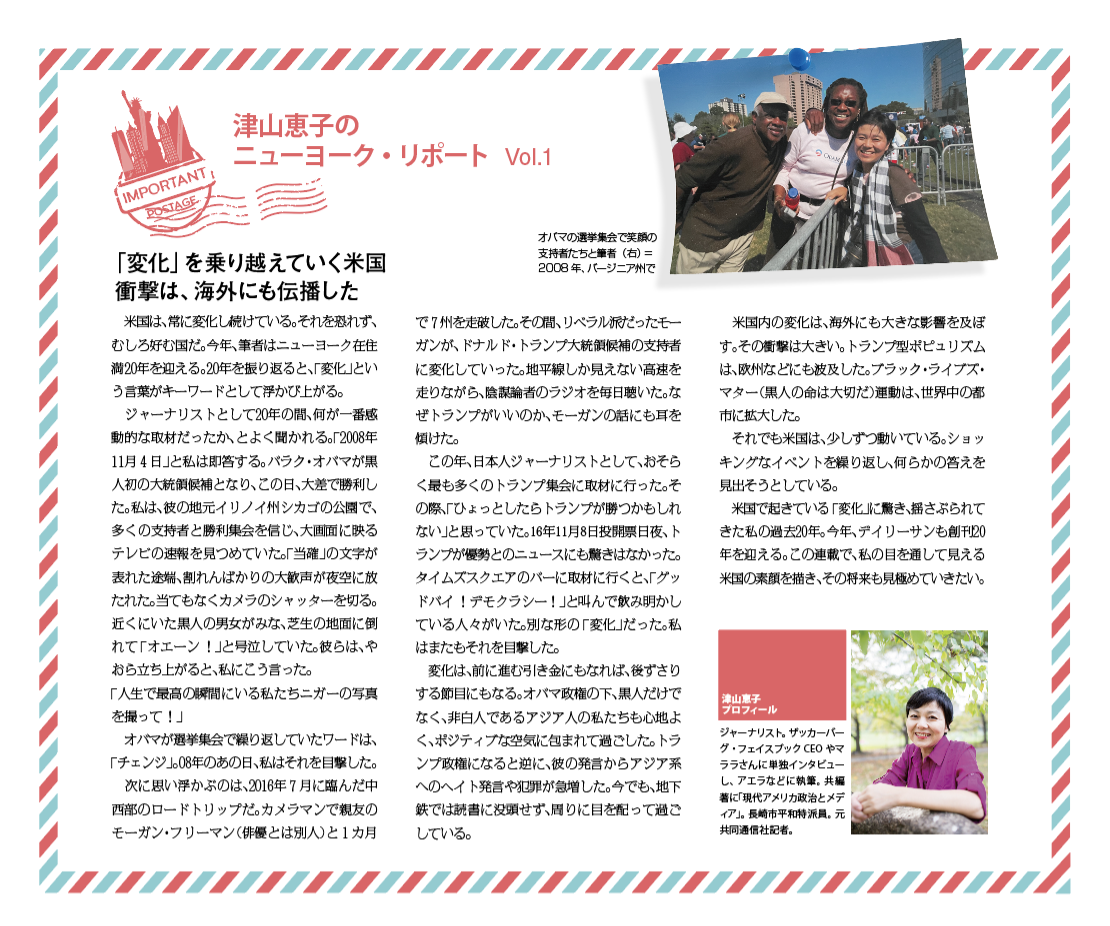 米国で起きている「変化」に驚き、揺さぶられてきた私の過去20年。今年、デイリーサンも創刊20年を迎える。この連載で、私の目を通して見える米国の素顔を描き、その将来も見極めていきたい。