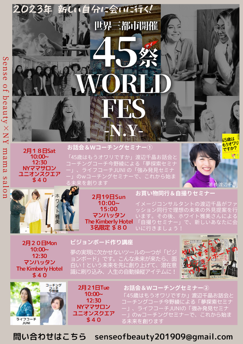 起業コミュニティ「Sense of beauty」による女性向けセミナー。2022年はロンドン、パリ、広島、博多、大阪で開催した「45祭フェス」を今年はニューヨークで開催する。2月18日(土)と21日(火)は「お話会&Wコーチングセミナー」、19日(日)は「お買い物同行&自撮りセミナー」、20日(月)は「ビジョンボード作り講座」。問合せはsenseofbeauty201909@gmail.comまで。