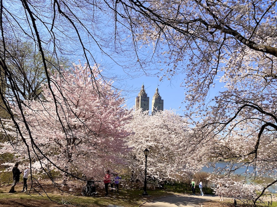 まずはセントラルパークのストロベリーフィールズ近くにあるチェリーヒル噴水から、湖を挟んで西側の双塔の高級アパートメント「サン・レモ」が見える景色をお奨めします。満開の時期には手前の桜が地面に届く滝のように枝がしな垂れ、一枚の絵画のような息を呑む景色が広がっております。是非今年も行きたいと思います。