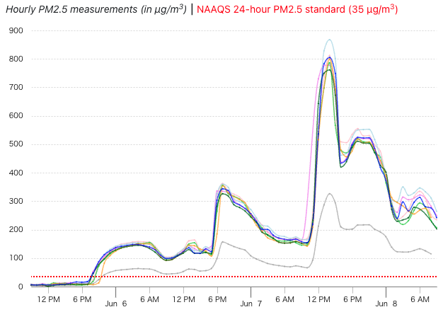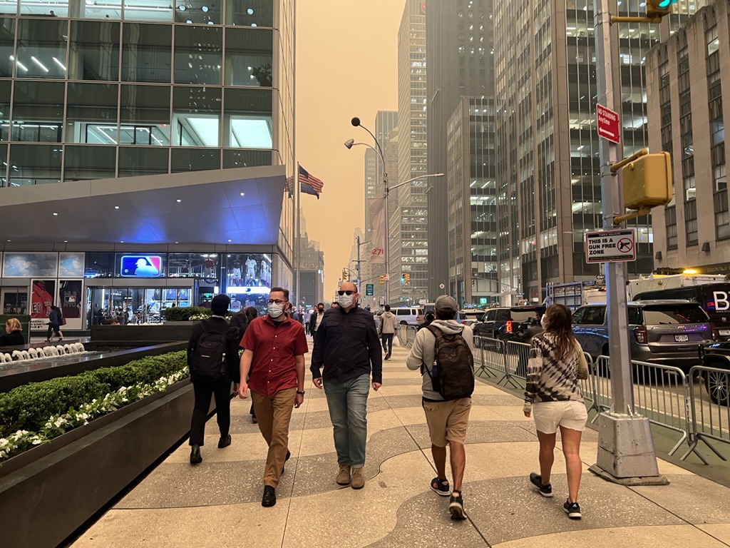 州環境保護局(DEC)は微細な「PM2.5」など粒子状物体の大気中濃度を市内の複数カ所でモニターしている。こうした微粒子は肺や血液に流れ込む可能性があり、健康被害が懸念される。米環境保護庁(EPA)は1立法メートル当たり微粒子35マイクログラムを「安全」としているが、市内の7日の平均値は377マイクログラム。安全基準の約11倍と、観測史上最悪を記録した。カリフォルニア州北部で発生した山火事の煙が流入した2018年11月16日のサンフランシスコや地元の山火事が大気汚染を起こした2020年9月13日のオレゴン州ポートランドの状況よりもひどかったという。