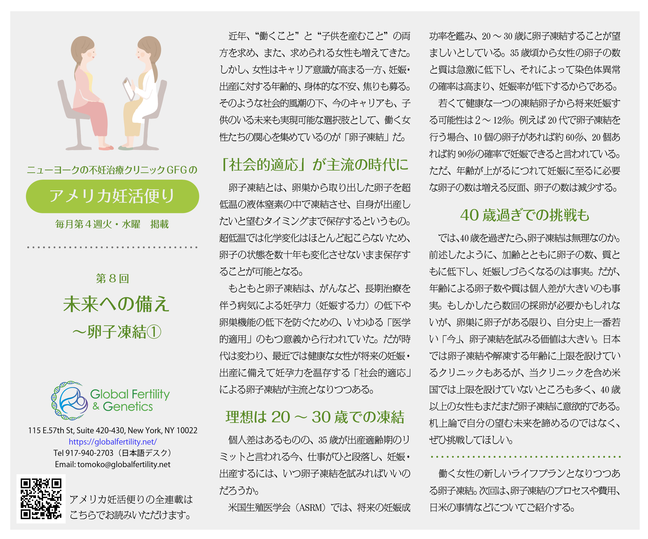 次回は、卵子凍結のプロセスや費用、日米の事情などについてご紹介する。
