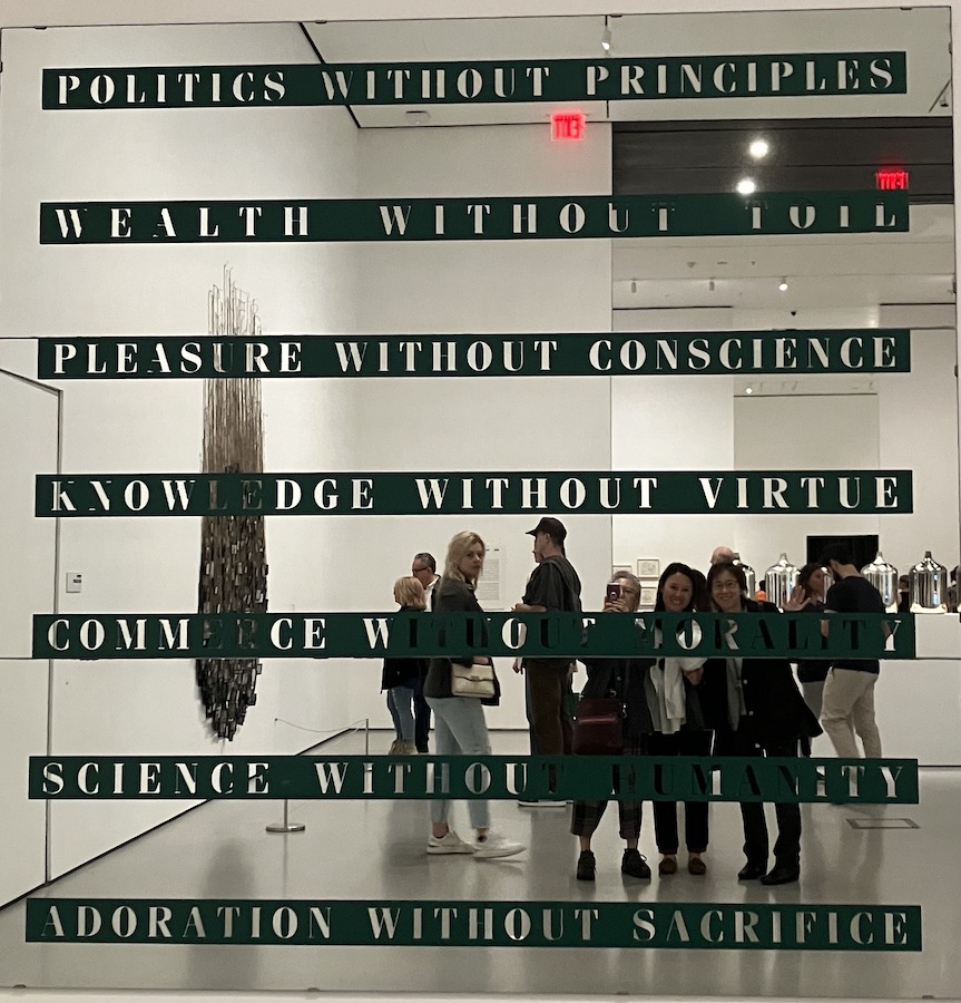 MoMAで展示されている作品『He Ram, he Ram (Oh god, oh god) 』は、1948年、マハトマ・ガンディーが暗殺者の銃弾に倒れ、死に瀕した際に発した最後の言葉である。鏡にスクリーンプリントされたテキストは、ガンディーが1925年に彼の週刊紙『ヤング・インディア(Young India)』に発表した「7つの社会的罪」を引用している:原則なき政治、労働なき富、良心なき快楽、人格なき教育、道徳なき商業、人間性なき科学、犠牲なき崇拝。これらの言葉は、ガンジーの墓石に刻まれている。