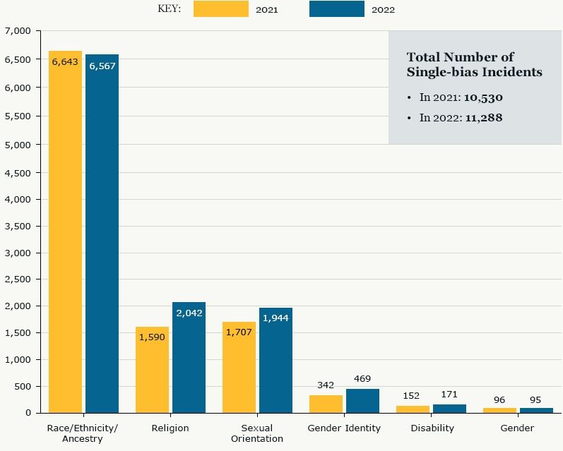 宗教、性的嗜好を理由にした憎悪犯罪が増加。黄色が21年、青が22年。 / 司法省のホームページより