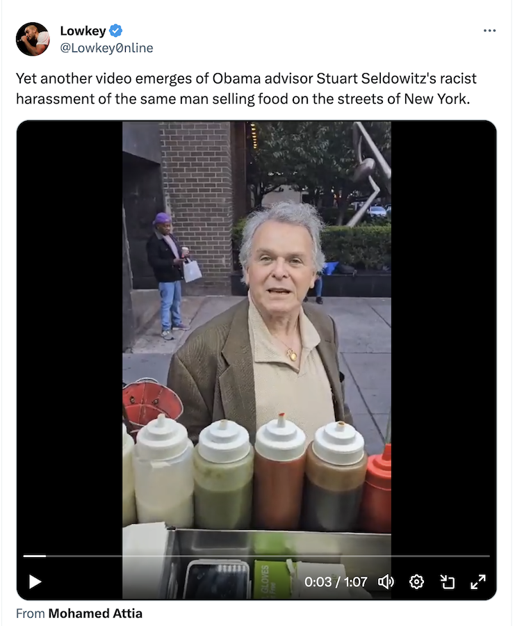 この元職員はスチュワート・セルドウィッツ氏。オバマ政権で国家安全保障担当高官を務めたこともある。数日間にわたり、同じフードカートを繰り返し訪れ「パレスチナ人の子供4000人を殺しても、十分じゃない」「モハメッドはレイピストだ」などとしつこく挑発。自分の携帯電話でベンダーの写真を撮る場面もある。困惑気味のベンダーは「あっちに行ってくれ」などと対応している。同氏は電話インタビューに応え、「ベンダーが『ハマスを支持する』と言ったのでカッとなった」と説明。「言い過ぎた。遺憾に思う」と続けた。