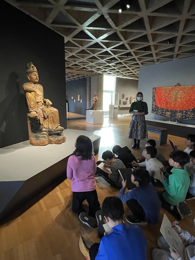 前半は、ミュージアムエデュケーターに案内してもらいながら館内をまわった。はじめに現代アートの絵画を、その後アジアの美術に関するコーナーで観音菩薩を鑑賞し、最後にゴッホの絵画をじっくり見た。それぞれの作品の気になった所や面白いと感じた所をスケッチし、エデュケーターの案内のもと、なぜそれをスケッチしたのか、それは何を表しているのか等、みんなで考えたり想像したりしながら、アート作品に親しんだ。後半には、ペアごとに館内をめぐり、自分の心がひかれた作品を見た中で、心に残った物を各々が一生懸命スケッチした。