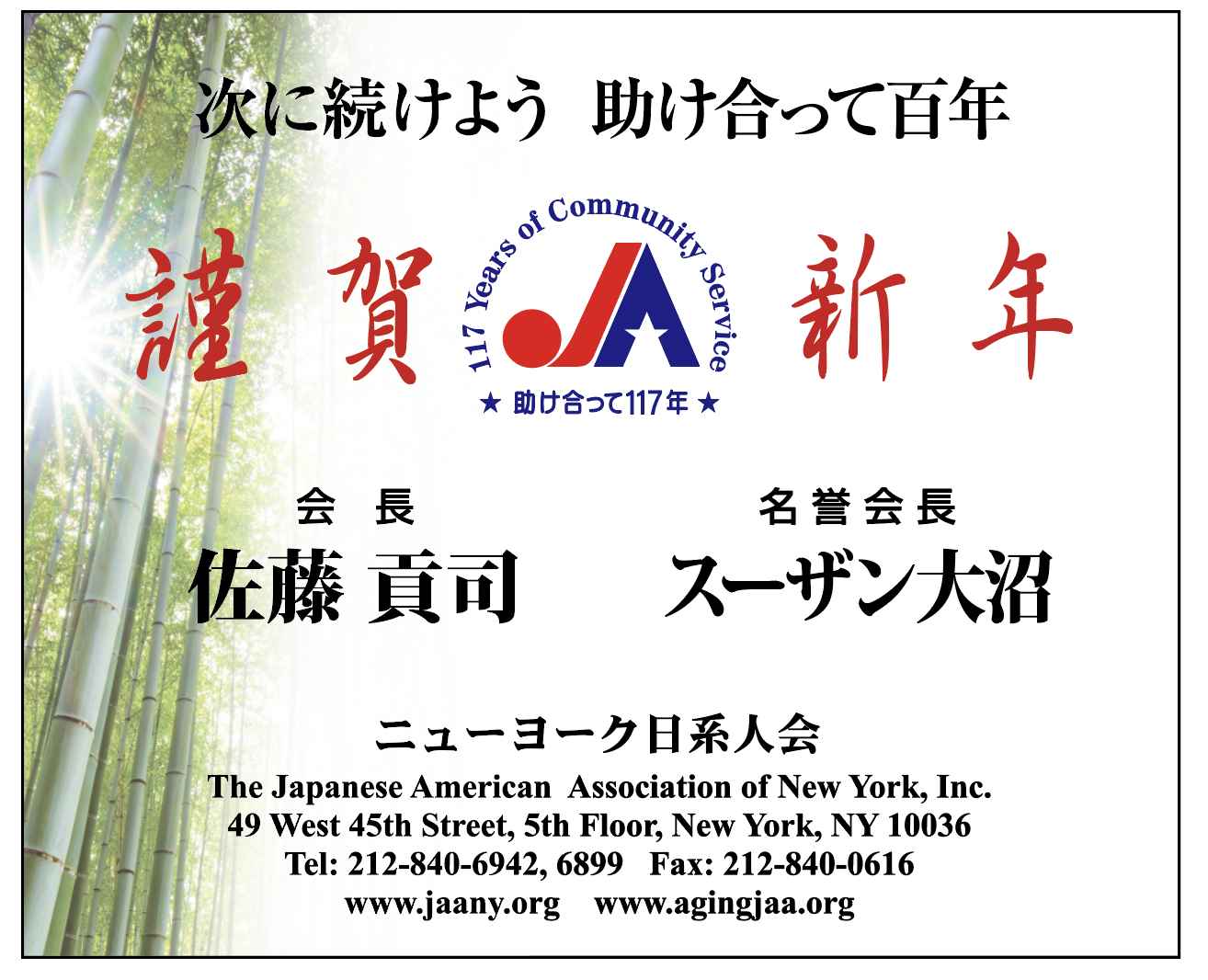 ニューヨーク日系人会は、在ニューヨーク日本国総領事館、日本の企業・団体、ボランティアの皆様のご支援に深く御礼申し上げます。くる年も「助け合って100年」をモットーにコミュニティのニーズにあった活動を続けて参ります。ご支援のほど、お願い申し上げます。