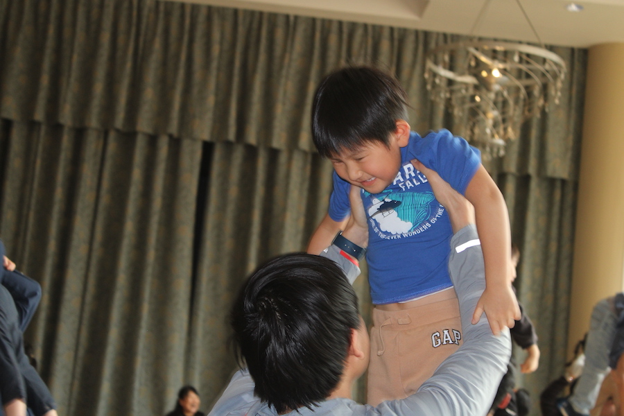クラス(お部屋)では、親子でふれあい遊びをしたり子ども達からお父さんに向けて歌をうたったり。ホールでは運動遊びで盛り上がります。毎日楽しんでいる体操から始まり、四つん這いになって並んだお父さん達の背中を渡ったり、下をくぐったり。顏を真っ赤にして頑張っていたお父さん、子ども達との体力勝負に疲れてしまったでしょうか。「アメリカに来て、一番体を動かしました!」と感想をいただきました。
