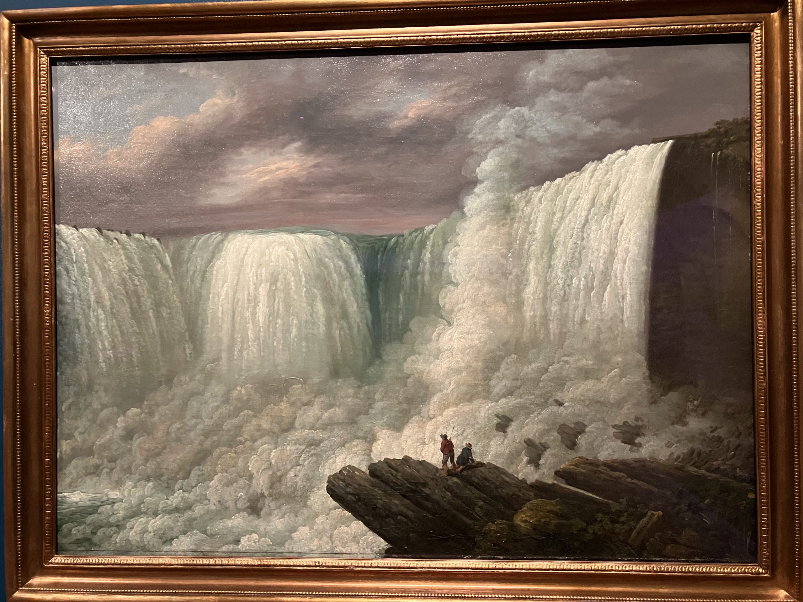 ウォーキングスティックの「ナイアガラ」の両脇には、女性作家ルイーザ・デービス・マイノット(Louisa Davis Minot、 1788-1858)が1818年に描いた「ナイアガラの滝」が展示されている(彼女の作品として認知されているのはこの2枚だけ)。彼女はハドソン・リバー派の女性6人のうちの一人として知られている。マサチューセッツ州司法長官の娘で、弁護士と結婚し、五人の子供を儲けた。絵を描くに至った経緯は知られていないが、彼女の腕は確かである。ヨーロッパの風景画には、ロマン主義の田園的風景画だけではなく、戦争や自然現象を描いた歴史的風景画がある。マイノットの「ナイアガラ」の背景には米英戦争(1812年戦争)がある。独立直後のアメリカと、イギリス、その植民地であるカナダ及びイギリスと同盟を結んだインディアン諸部族との間の戦いで、米英が領土を奪い合った北米植民地戦争であり、また両陣営がインディアンに代理戦争をさせたインディアン戦争でもあった。滝の激しさは自然だけでなく人間の争いを描いている。絵の右下方には人間が小さく描かれ、大自然の中のちっぽけな存在を強調している。彼女は絵だけでなく社会情勢についての記事を書いていた。19世紀初頭にこれだけ知的な女性がいたことに驚く。それだけではない。ハドソン・リバー派の創立は1825年と言われているが、マイノットの絵はその7年前に描かれたものだ。