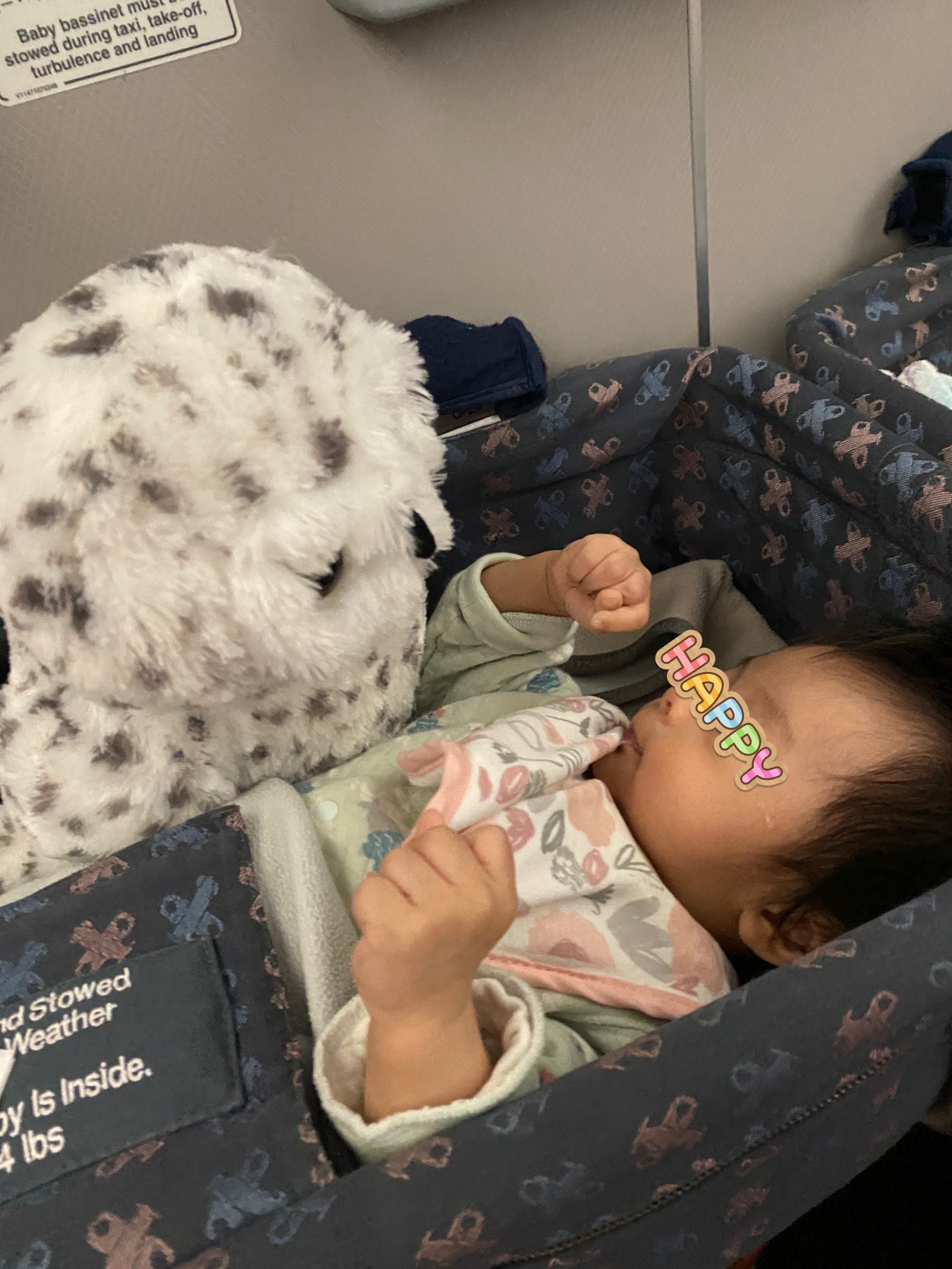 日本へ帰国するフライトの時はまだバシネットにぶら下げられるおもちゃは持っていなかったので、食事の時に赤ちゃんが泣き出してしまってどうしようかと思いましたが、お兄ちゃんが飛行機のお供に持っていたフクロウのぬいぐるみをダメもとで赤ちゃんの横に置いたら、15分くらい持ちました笑!その間に急いでご飯を口の中に突っ込みました笑。まさかのフクロウのぬいぐるみが子守をしてくれるという奇跡。大事なぬいぐるみを貸してくれたお兄ちゃんにも感謝♪
