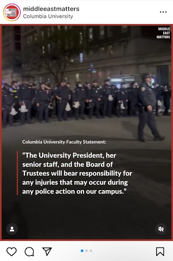 4月30日未明、キャンパス内に隊列で突入する警官隊。(Middle East Mattersのインスタグラム(@middleeastmatters)からスクリーンショット)