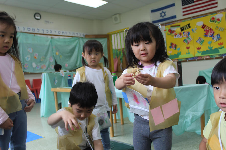 今年のテーマは「ぼうけんしよう!」。当日を迎えるまでの約1カ月間をかけて、準備していきます。5才クラスでは、乗り物に乗って恐竜を見に行く「恐竜ライドの部屋」、4才クラスは卵や宝石を探す「発掘の部屋」、3才クラスはジャングルの中のトンネルや橋渡りをする「オアシス」の部屋を再現しました。また、パーティーで楽しみなお弁当の時間に食べるクッキーやゼリーのデザートを作ることにも挑戦しました。