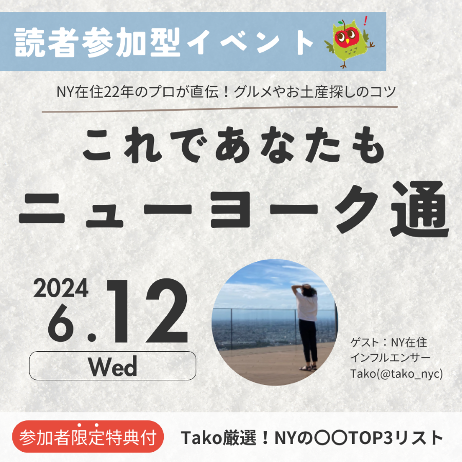 美味しいお店の見つけ方、ガイドブックには載っていないオススメ散歩道など、今後のNY生活がより楽しくなる濃密な情報をお伝えします!
