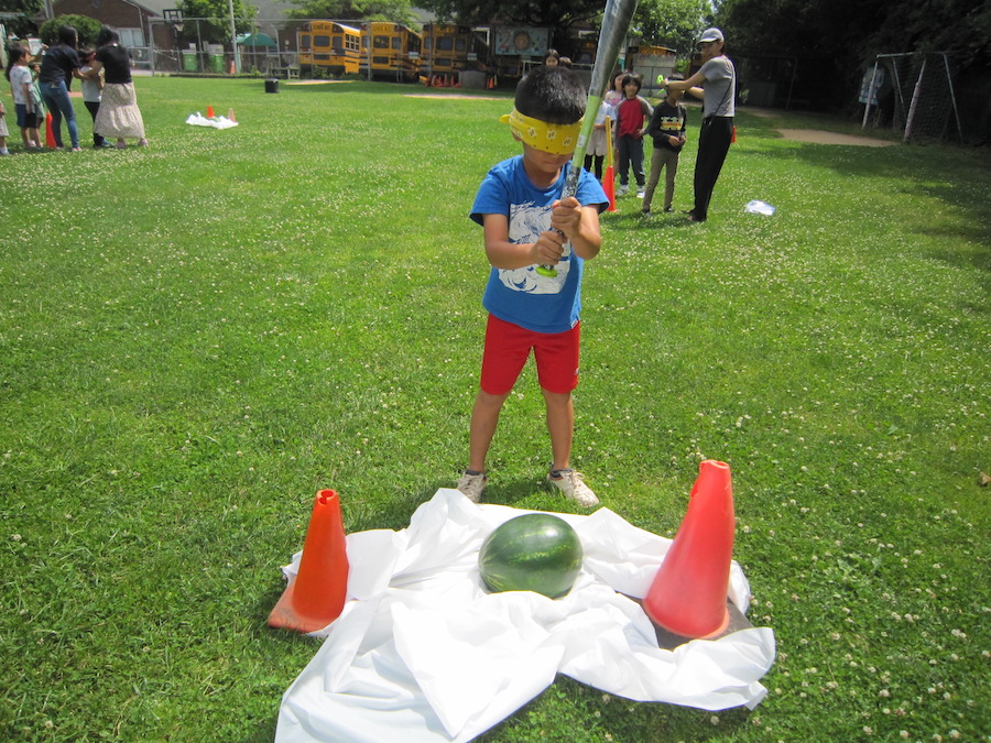 当日は、園庭に大きなスイカが5玉用意され、子どもたちは大歓声を上げた。幼児部から6年生までが混合で構成された5つのグループが協力し、スイカ割りを楽しんだ。子どもたちはバットを持ち、目隠しをされた状態で数回回った後、友達の声を頼りにスイカに向かって進み、力いっぱいバットを振り下ろした。スイカに命中する子、惜しくも外してしまう子など、さまざまな反応が見られた。