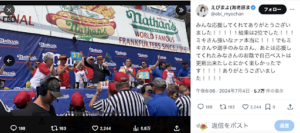 ホットドッグ早食い大会、須藤さん優勝 2位、えびまよさんとともに自己新記録