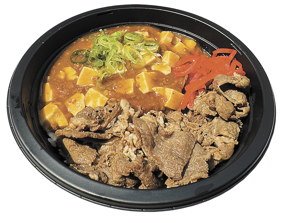 お客様からのリクエストで誕生した2つの味を一度に味わえる、お得なメニュー。滑らかな絹豆腐にピリッとした辛みの自家製麻婆ソースを絡めた麻婆豆腐。牛丼の牛肉はうま味がしっかりと味わえるリブアイを使用し、出汁のうま味を効かせています。