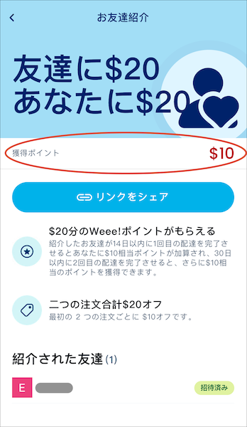 アプリからお友達を紹介することで、それぞれWeee!のお買い物で使える$20のポイントがもらえるお得なサービスです。