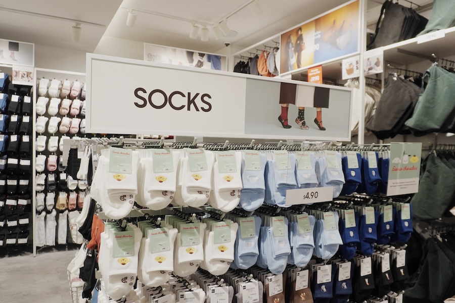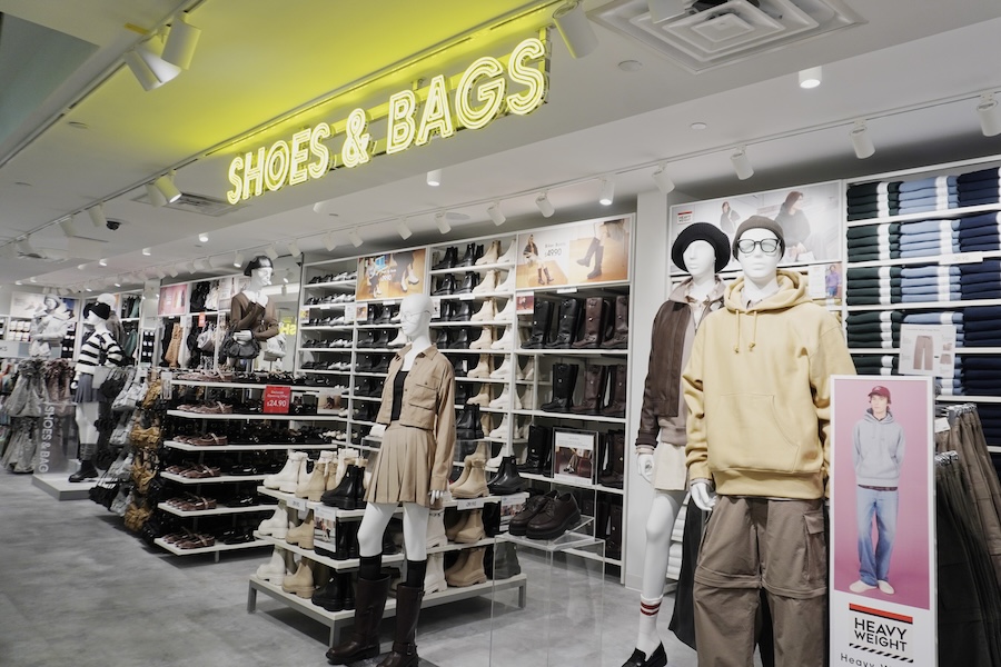 また、パーツの取り外しができ、1着でさまざまな着こなしができると近年注目されている「マルチウェイ」な商品も象徴的に展示。「小物のジーユー」を改めて印象付けるため、地下階にはシューズ・バッグ・ソックスの多種多様なアイテムがずらりと並べられたりと、同ブランドの強みや魅力を再発見できるような空間となっている。