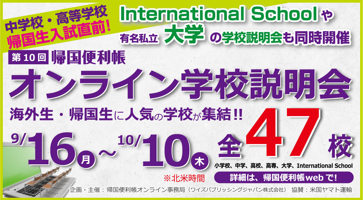 海外在住の帰国子女に焦点を当てた教育情報誌「帰国便利帳」を制作発行、世界13カ国、41都市で無料配布しているワイズパブリッシング・ジャパンは10月10日まで、入試直前の傾向と対策をテーマにした「第10回オンライン学校説明会」を開催中。期間中は、帰国生を受け入れている中学、高校、高専、インターナショナルスクール47校が参加。毎日2〜3校が登場し、受験生の疑問に答える。講師の顔出しはないが、チャットから学校へ質問ができる。予約は下記のリンクから。