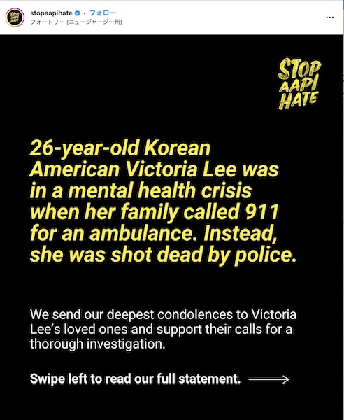24日付ニューヨークタイムズによれば、殺害されたのは、ビクトリア・G・リーさん(25)。兄が7月28日朝、治療のために病院に連れて行く前にリーさんがメンタル面で危機的な状況を迎え、「折りたたみ式ナイフを持っている」と911に通報した。それから1時間も経たないうちに、リーさんは殺害された。警官が到着した際、リーさんはアパートへの入室を拒み、警察官の1人を刺すと脅した。公開された映像によれば、施錠された玄関ドアを突き破ったトニー・ピケンズ・ジュニア警官が「ナイフを捨てろ」と叫ぶと、リーさんは前進したため、警官は発砲した。