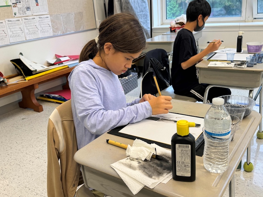 ニューヨーク日本人学校(コネティカット州グリニッチ、岡田雅彦校長)は9月26日、墨絵教室を開催した。この日参加した5年生8人は、書写の授業を毎週受けているが、墨と筆を使って絵を描くことはほとんど初めての体験だった。事前にテキストをもとに予習していたがが、子どもたちからは期待と同時に不安の声も聞かれた。