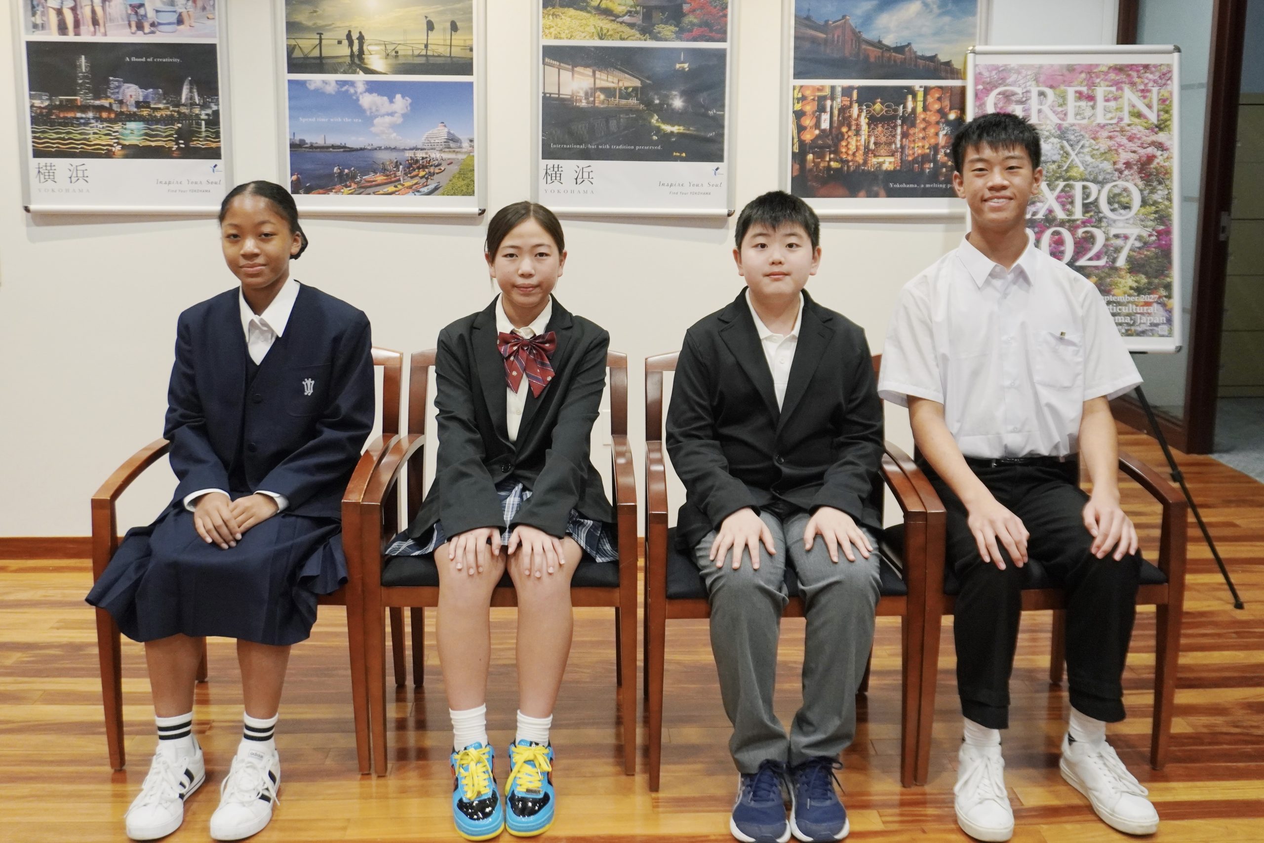 「よこはまピースメッセンジャー」に選抜された4人の生徒(左から)イグウェ ケイト友菜さん、志村 優妃さん、加藤 夢丸さん、林 睿騰さん