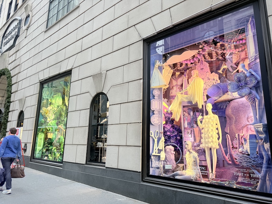 ゴージャスなアート作品として毎年、ニューヨーカーの目を楽しませてくれるBGのホリデーウインドウ。2024年のテーマは「Toast of the Town」。レディース館(西側)はニューヨークの街を彩る公園の植物や生物、彫像を、メンズ館(東側)は街の風景とホリデーパレードなどの季節の風物詩を表現。