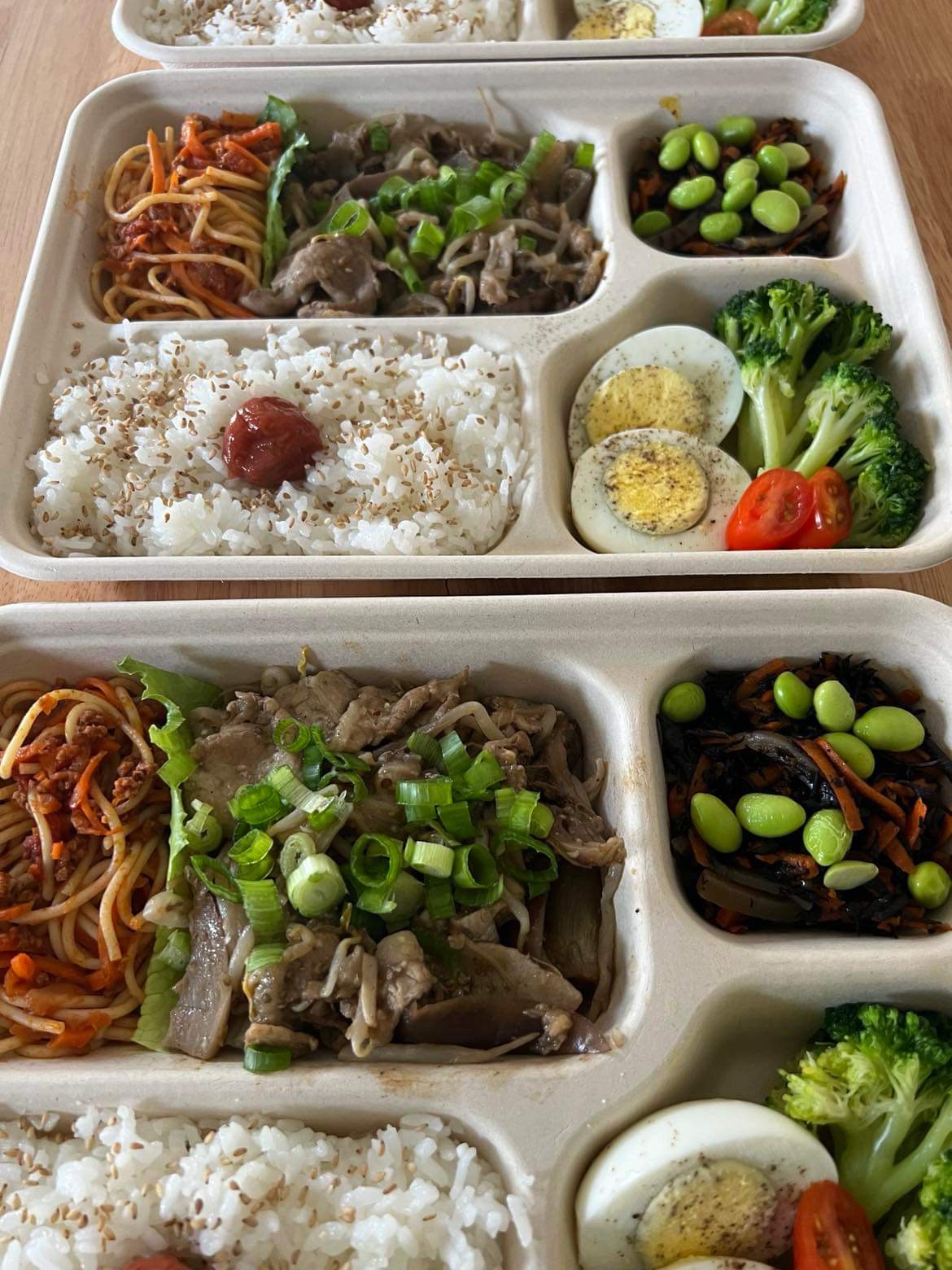ミートソーススパゲッティ、枝豆たっぷりひじきの煮物、ゆで卵、ブロッコリー、ミニトマト添え。もち米ブレンドのご飯。