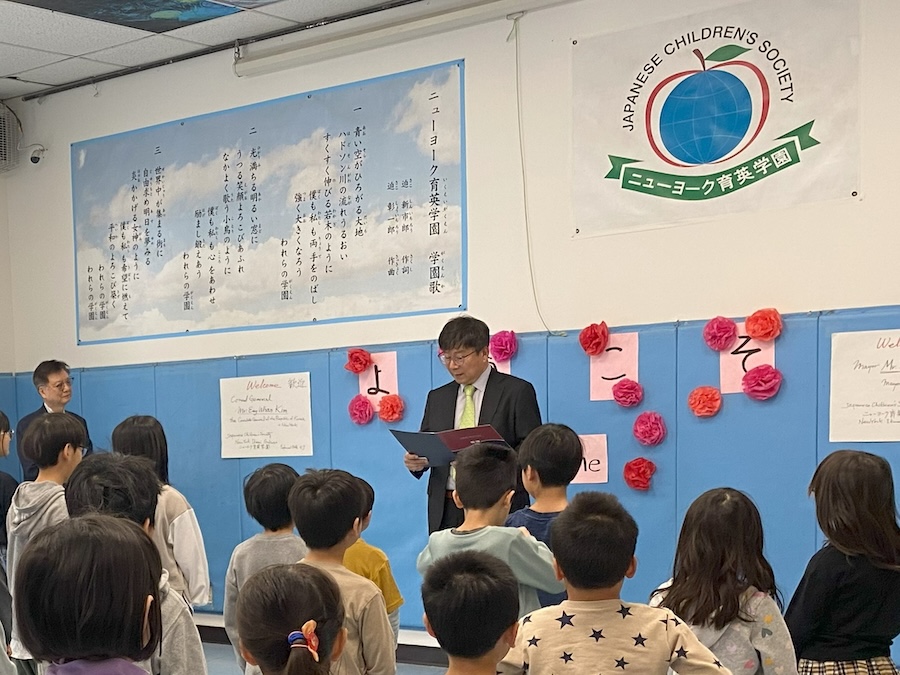当日は、子どもたちが金総領事と朴市長を出迎え、児童会副会長の小堀麻絢さん(小5)が訪問に対するお礼を英語で堂々と述べた。金総領事は、「未来はあなたたちの手の中にあります。今日の皆さんは、明日の希望であり、平和と友情の架け橋になります。韓国と日本は、過去2000年の間、友人であり隣人でした。今後も両国の友情を育んでください。夢を信じて進んでください」と流ちょうな日本語で語りかけた。またパク市長は、昨年12月に行われたダブルダッチの国際大会で、ニューヨーク育英学園が3位に入賞したことにふれ、「あなたたちはイングルウッドクリフス市の誇りです。私は移民一世で、英語もネイティブでないにもかかわらず市長になれました。小さい頃からアメリカで育っている皆さんには大きなチャンスがあるので、ぜひ頑張ってください」と励ました。