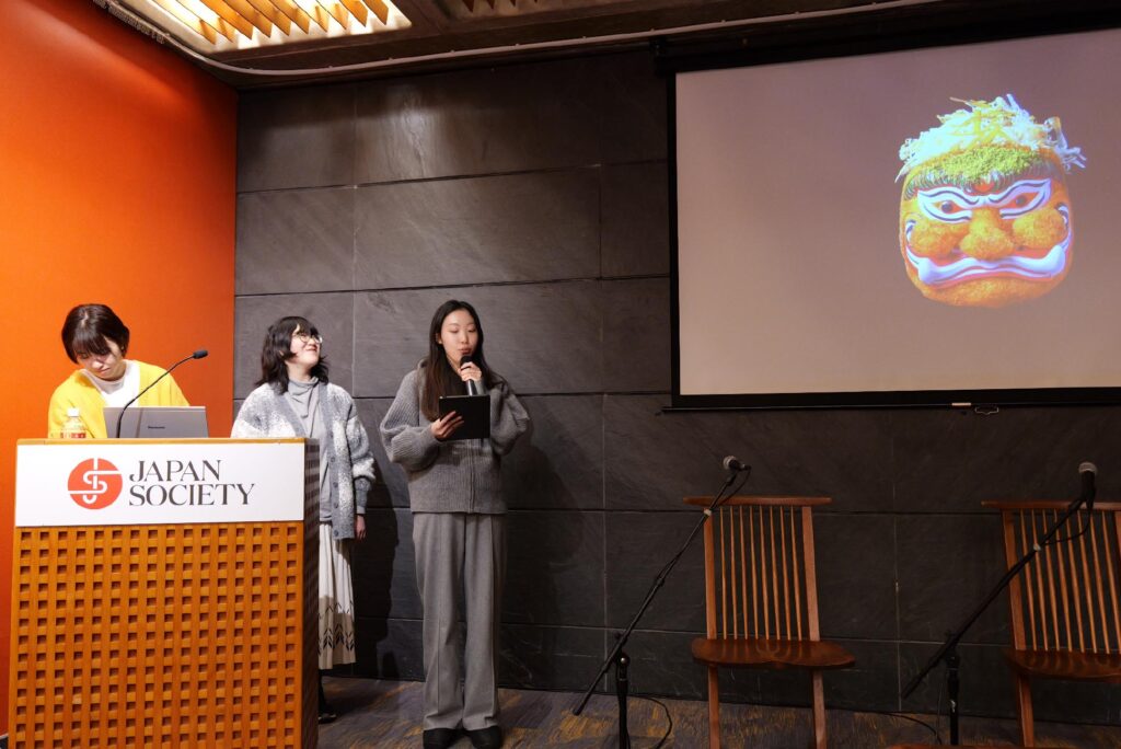 当日は、選抜され来米した大学生・高校生6人による発表と、スペキュラティブ・デザインの先駆者として知られるパーソンズ美術大学教授のアンソニー・ダンさん、フィオナ・レイビーさん、同プログラムの担当教員で京都大学特任准教授の本多正俊志さんのパネルディスカッションが行われた。生徒らは、ヒトの神経伝達物質や脳波長、環境音を雅楽の各楽器の音調にプログラミングで自動変換する機能を開発し、アプリとしてストレス社会における瞑想に活かす作品や、能楽が神様を祀るものであることを念頭に、超合理主義が進み現代食の有難みが失われた近未来社会において「とんかつ」の神を祀る独自の演目を披露し、それぞれ生成AIなどを活用した。