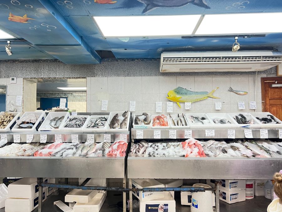 店内に入ったら、ビニール袋片手に魚介コーナーへGo!食べたい種類を好きなだけ袋へ。ポンドあたりの価格表記があり、量り売り形式。 アメリカでおなじみのシーバスや、日本人にも馴染みのある鯛、サーモン 、イカ、エビなど種類が盛りだくさん(季節/時期により異なる)。
