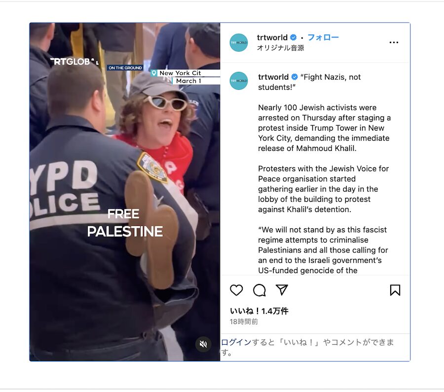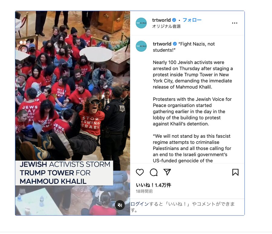 連邦移民当局が親パレスチナの学生活動家、マフムード・ハリルさん(30)を逮捕したことに抗議するデモ隊約100人が13日、トランプタワーを占拠し、ニューヨーク市警察(NYPD)に逮捕された。ティファニーなど高級店が並ぶミッドタウンの一帯は一時騒然となった。NBCニュースが同日、伝えた。民主主義国家アメリカで、最大の都市ニューヨークにある現職大統領の自宅が占拠されるのはきわめて異例なこと。トランプ政権の「混沌」を象徴する事件となった。