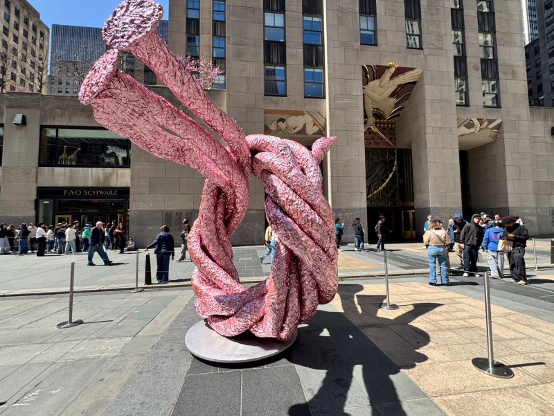 ロックフェラーセンターにカラフルなジョン・チェンバレン(John Chamberlain)の巨大彫刻が登場し、行き交う観光客も注目している。