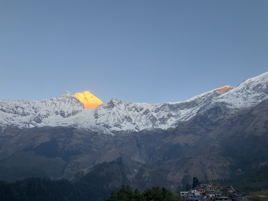 最初にダウラギリ山頂(標高8,167m/26,795フィート、富士山の2倍以上)が金色に輝く。