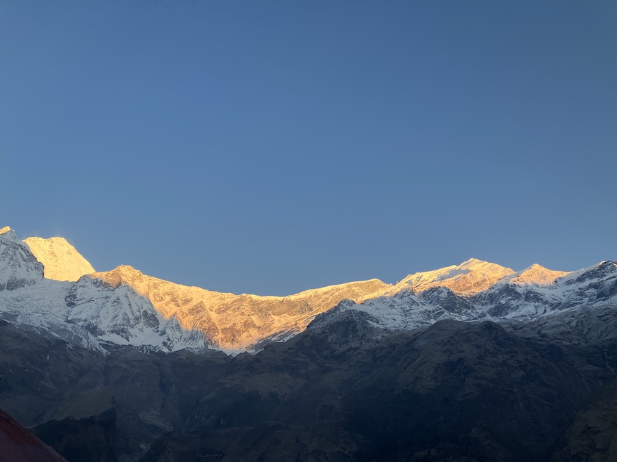 2000年に建てられたロッジは、ダウラギリ(世界第7位の高峰、標高8,167m/26,795フィート、富士山の2倍以上の高さ)を含むアンナプルナ山群を360度遮るものなく見渡せる、とんでもないロケーションにあった。ホテルで働くスタッフは近くの村に住んでいる。ロッジのオーナーはネパール人と日本人の奥さんで国際的な高級ホテルチェーンには属していない。宿泊施設は気が利いていて居心地がいい。ネパール料理が好きな私だが、裏庭の畑で採れた野菜を使った日本風のロールキャベツやチキンカツはありがたかった。日本式の大きなお風呂もとても良かった!
