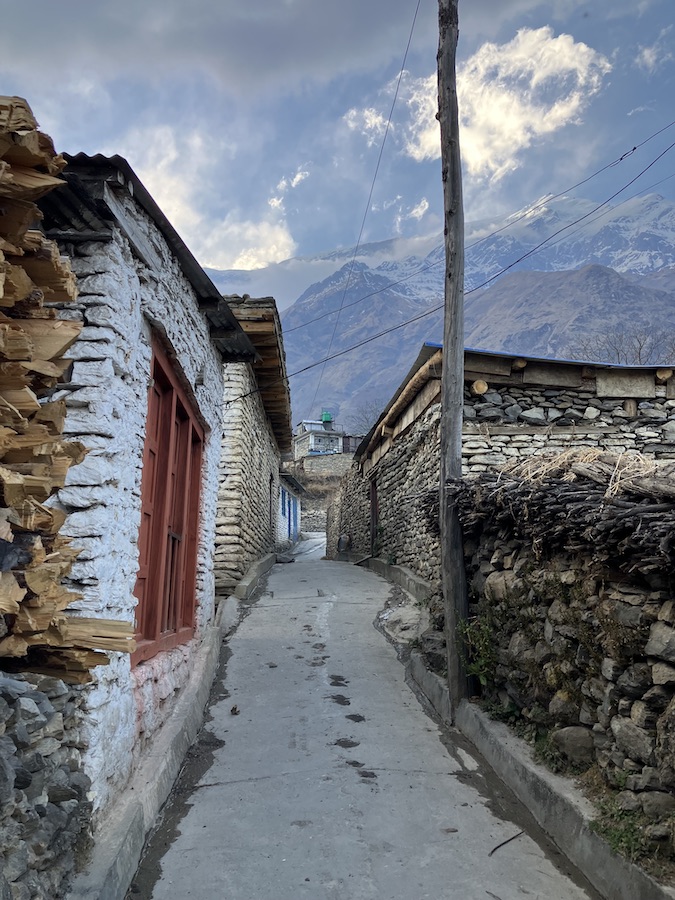 ポカラから北上するために、インド製の4WDを運転するドライバーを雇った。山沿いの道はガードレールもなく、眼下の渓谷まで急降下する難路だった。途中、対向2車線のハイウェイが1車線になり、交互に通行する必要があった。後部座席に座って揺られていただけでスマートウォッチに「ワークアウト終了」の通知が表示された。数日間滞在したタサン村のロッジに辿り着くまで一日がかりだった。