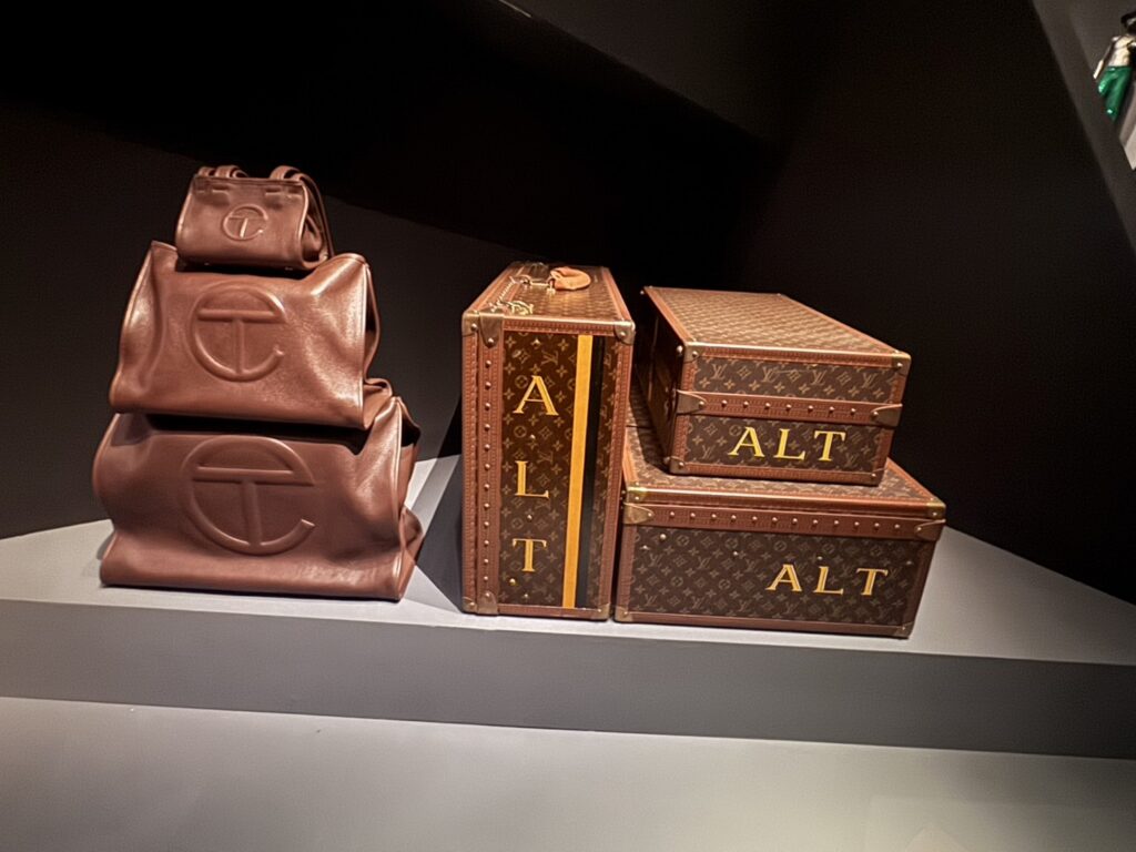 2024年に発表された「テルファー × ウィルソンズ・レザー」のキャリーバッグ(写真左)。大きなTロゴが特徴で、ジェンダーフリーかつユニバーサルなデザイン。「ブルックリンのバーキン」とも称される逸品。エルメスのバーキンバッグが「富と特権の象徴」であるのに対し、テルファーのバッグは「誰でも手が届くラグジュアリー」を掲げ、多様なアイデンティティーを尊重する現代的ラグジュアリーの象徴となっている。ALTのヴィトンと並べて展示されることで、新旧のブラックラグジュアリー像を浮かび上がらせる。