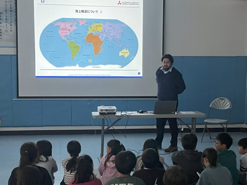 米国三菱倉庫(Mitsubishi Logistics America Corporation)社長の富田明さんと、豊田清さん、古野朋子さん、大西玄さんの4人が5月21日、ニューヨーク育英学園を来訪、4〜6年生たちに向けて、「グローバルロジスティックス」をテーマに出張授業を行った。
